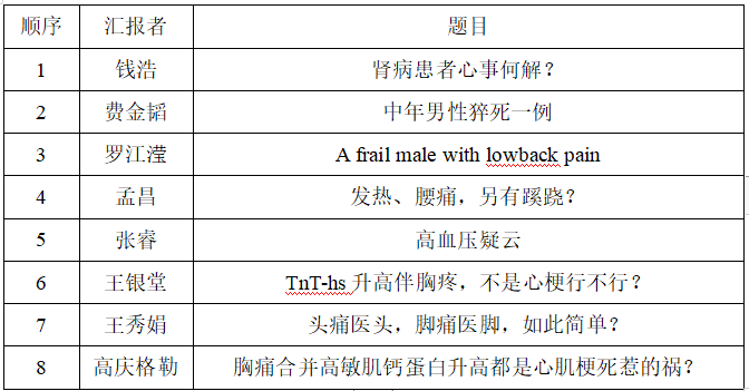 此次病例大赛的参赛选手均为心内科住院医师和研究生,他们精心选取自己亲历诊治的病例,从病例特点、诊断依据、鉴别诊断、治疗策略、预后等方面分别进行分析讨论,题目新颖,并充分结合最新文献或指南、融入理解与思考,各尽所能,展显风采。赛程如下表: