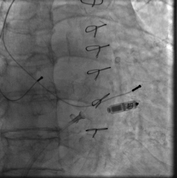 患者为81岁老年男性,既往因房颤伴长间歇植入双腔永久起搏器,患者曾因起搏器电量耗竭先后更换过2次传统双腔永久起搏器。目前起搏器电量接近耗竭,目前体内一根导线废弃,另一根导线功能障碍,需再次更换起搏器。患者为高龄男性,合并高血压等多种慢性疾病,为起搏器更换术后感染高危人群;由于目前患者的起搏器导线故障,甚至需要再次植入一根新的起搏器导线。届时患者体内将有3根导线。心内科经过充分术前讨论,认为患者具有无导线起搏器的指征,同患者及家属沟通后,患者及家属一致要求更换无导线永久起搏器。