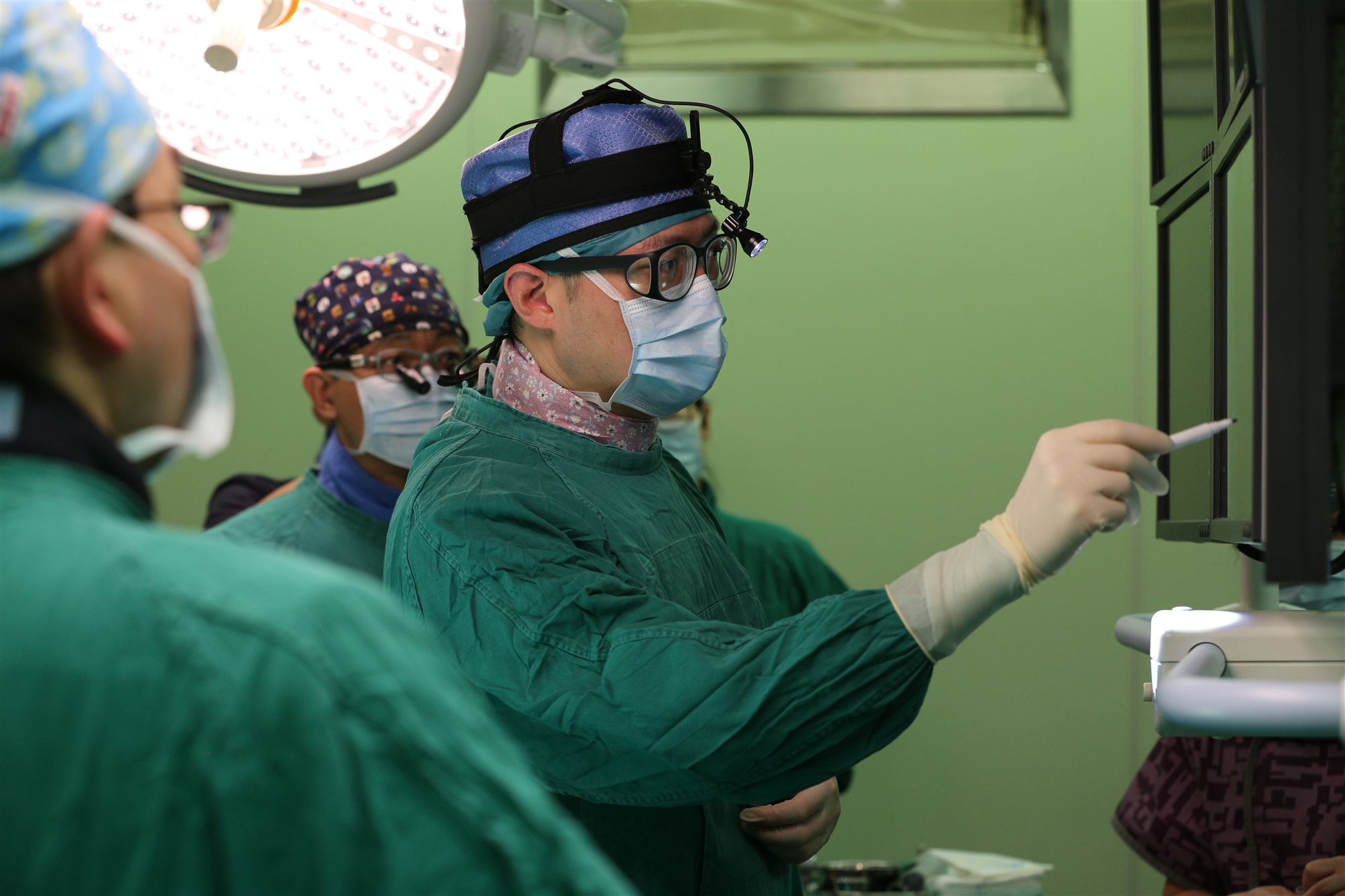 魏来教授(右一)分析主动脉根部造影
