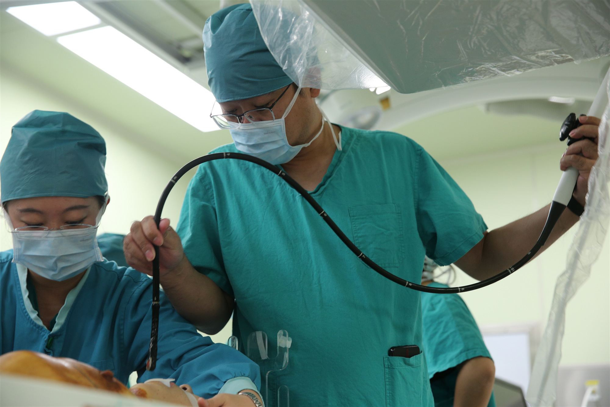 高志峰主任医师(右一)放置食道超声监测沈冬焱主任(右一)暴露患者股动静脉