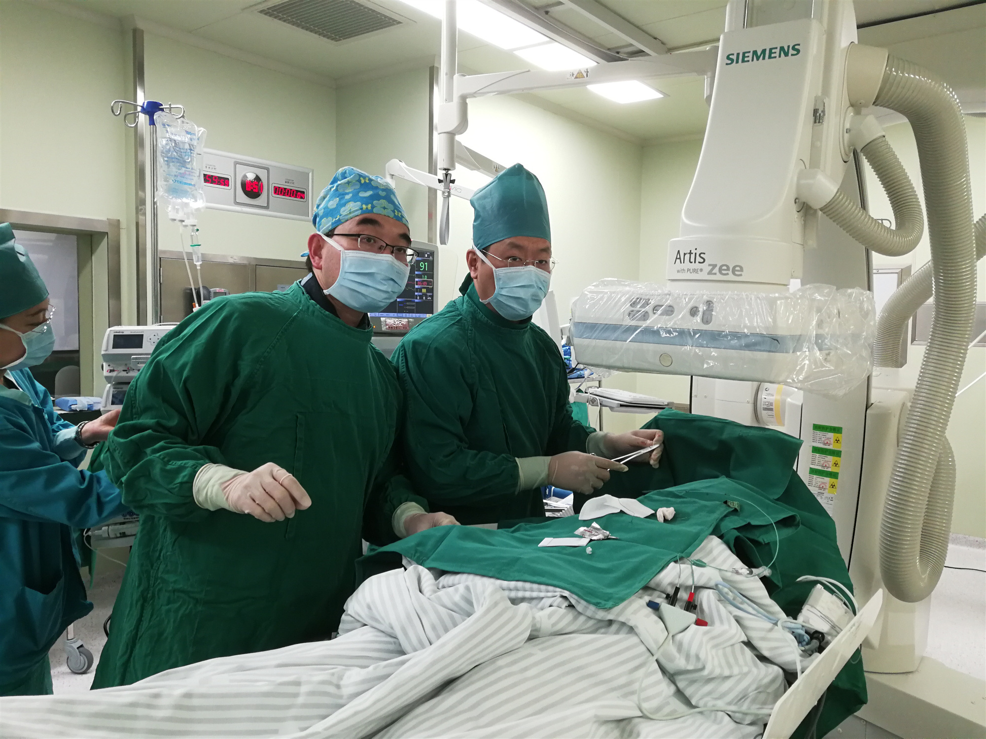薛亚军(左二),佘飞(右一)两位医师放置临时起搏电极