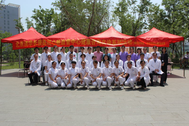 5.21,初夏一个晴空万里的日子,早上7点多钟清华长庚医院住院部前的小花园里出现了一群忙碌的白衣天使,他们迅速地搭起一座座凉棚,整齐地摆上一排洁白的桌子,码放好一排排椅子,飘动的红色条幅上书写着“北京清华长庚医院心脏血管中心健康咨询系列活动——了解危险因素,保护您的心脏和血管”。