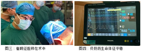 在麻醉科和手术室的积极配合下,手术定在入院第4天,即12月19日进行。由李温斌主任与崔晓征医师共同为佟奶奶进行了手术,手术历时5个多小时完成,术后佟奶奶被转入了监护室病房,第二天便基本撤除了辅助循环的血管活性药物,目前仍在恢复过程中。