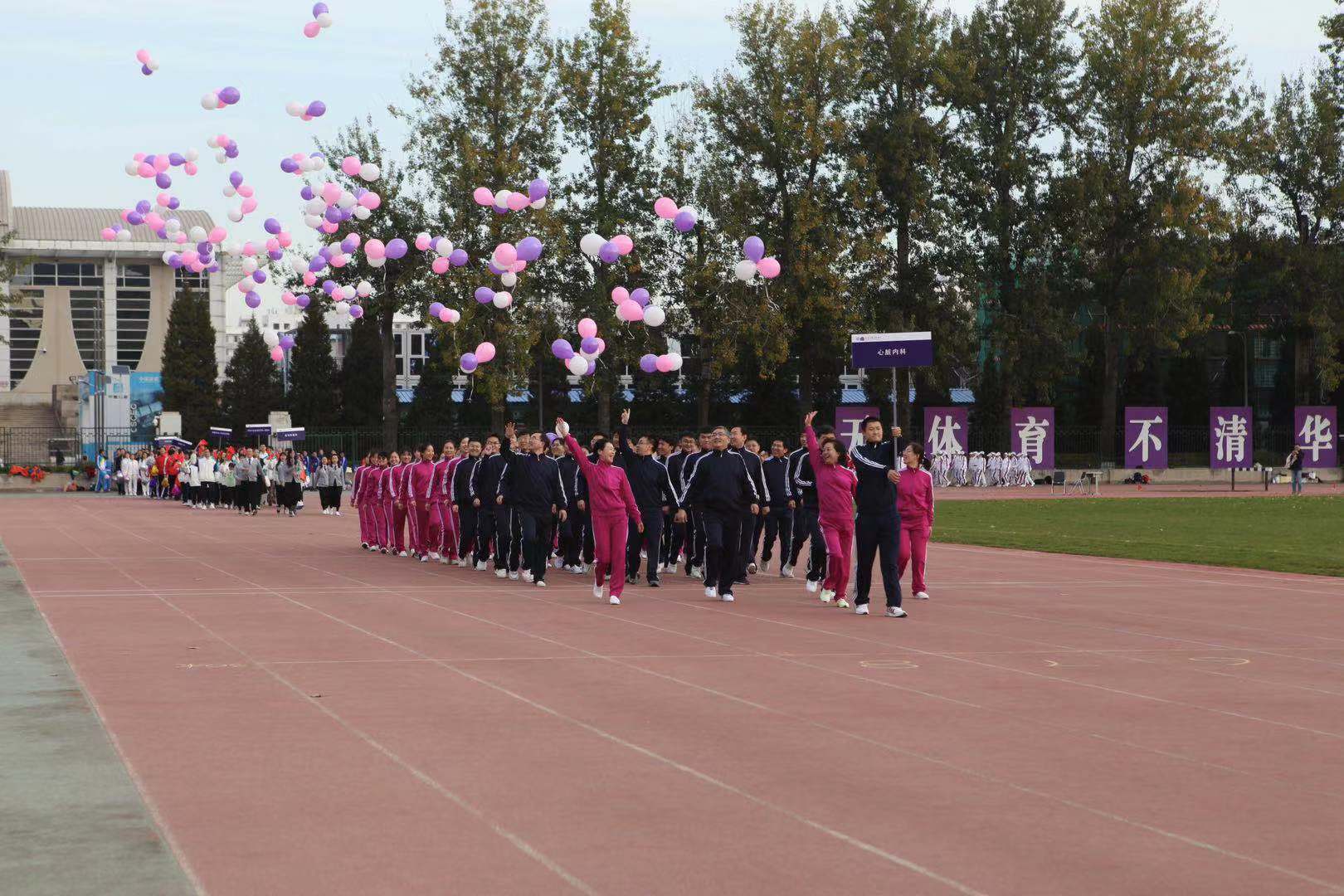 图1 心脏内科的健儿们心怀祖国,手举彩色气球,步伐整齐,口号嘹亮,在主席台前放飞气球,表达对伟大祖国的敬爱之情。