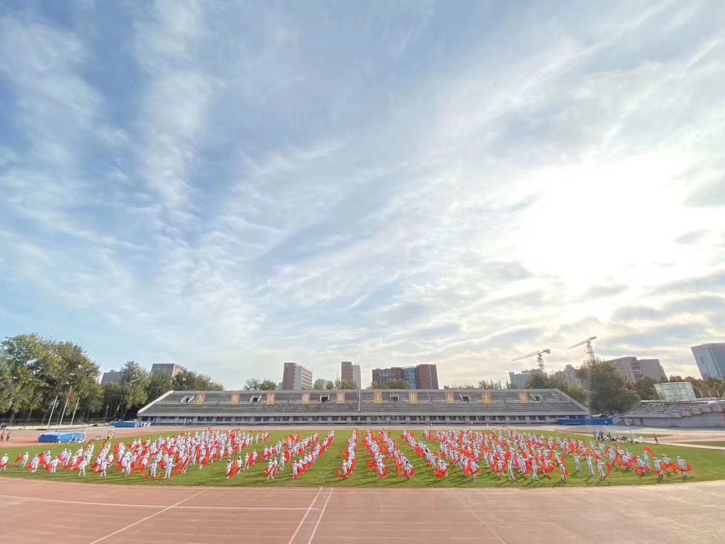 图3 蓝天白云下,400余名职工手持红绸,动作整齐划一,舞出对祖国的热爱。