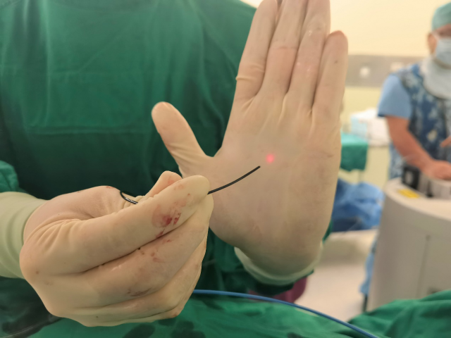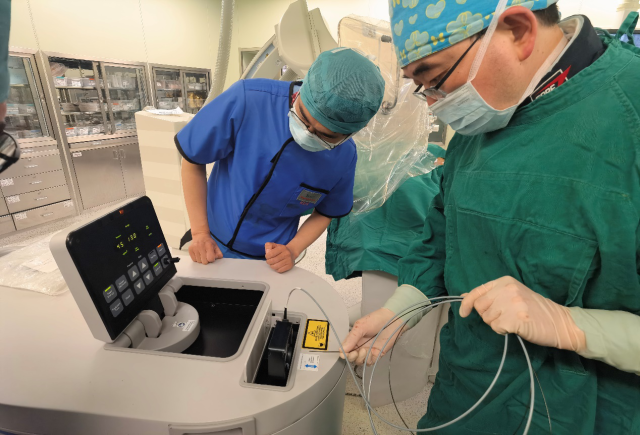 图2 薛亚军副主任医师展示激光消融导管头端的工作状态