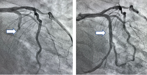 图1 手术直播冠脉造影检查,白色箭头为左回旋支闭塞血管介入处理前后对比