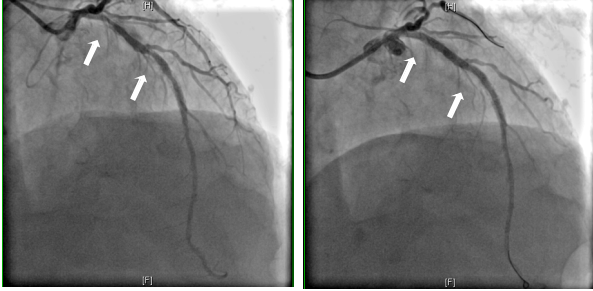 目前,冠状动脉介入治疗已成为冠心病的常见治疗方案,但随之而来的支架内再狭窄成为了困扰术后患者的重要难题。患者孟先生4年前在外院因急性广泛前壁心肌梗死于,前降支植入支架,2年前出现阵发性胸痛,使用普通球囊扩张后症状有改善。近期,他又出现反复胸闷、胸痛的症状,冠状动脉造影复查提示,冠脉血管支架再次出现严重狭窄。另一位患者姚先生,1年前因急性下壁心肌梗死于右冠状动脉植入支架,近期再次复查,同样提示了右冠中段支架内再狭窄。