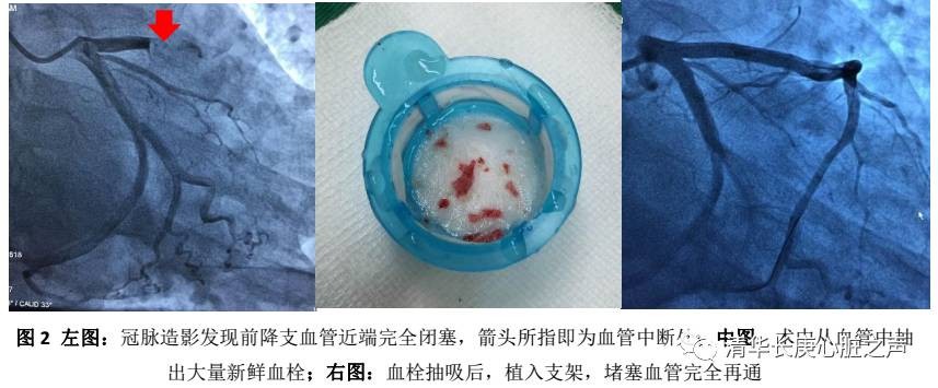 该患者就诊后不到半小时,就被送入位于医院主楼4层手术中心的心脏介入导管室,心脏内科介入团队迅速完成冠状动脉造影,证实患者为前降支动脉近段完全闭塞(见图2),随后通过指引导丝,应用血栓抽吸导管先后从患者病变血管中抽出数块新鲜血栓,成功开通血管,并植入支架,很快恢复了患者的冠状动脉血管再灌注,挽救了濒临-坏死的心肌,也成功挽救了一条年轻的生命。