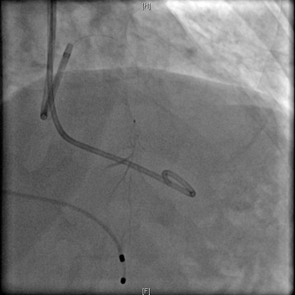 图: 冠状动脉第二间隔支S2粗大(左) 图: 造影示冠状动脉S2闭塞(右)