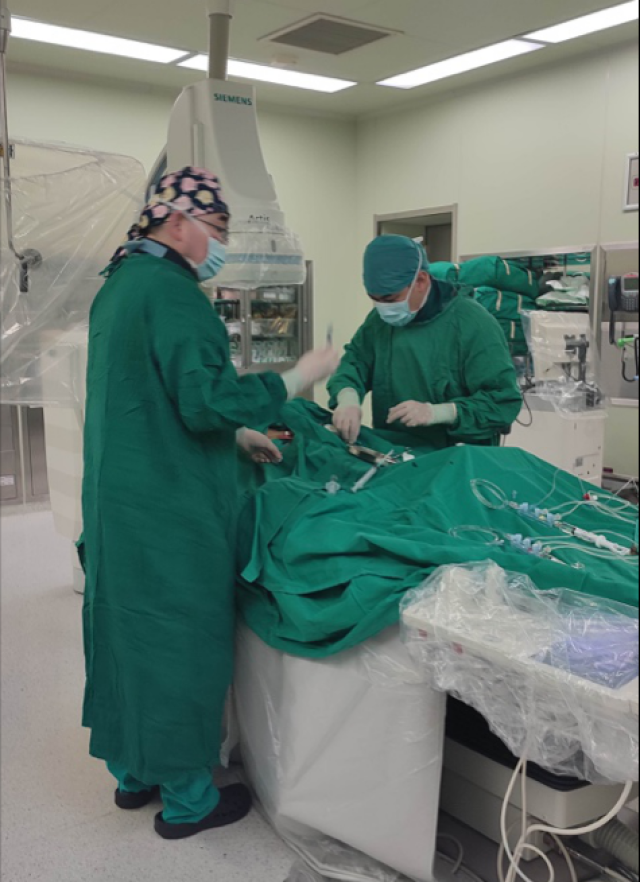 2021年8月17日,在副院长张萍教授的带领和王伟民教授的指导下,薛亚军教授、缪国斌教授、白静教授、孔令云教授及导管室、监护室的通力合作下,以默契的团队配合、精准的手术操为一名66岁肥厚型梗阻性心肌病患者一举解除“心病”,成功完成首例经导管室间隔酒精消融术。