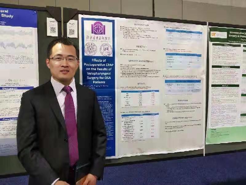 胡斌医师和何牧医师作为首次参加AAO-HNSF年会的青年医师,均受邀进行了大会发言。胡斌的发言主题为OSA患者开闭口对影像学评估的影响。何牧医师汇报了悬雍垂腭咽成形术(UPPP)治疗成人OSA患者远期手术疗效的最新荟萃分析,并进行了壁报展示。