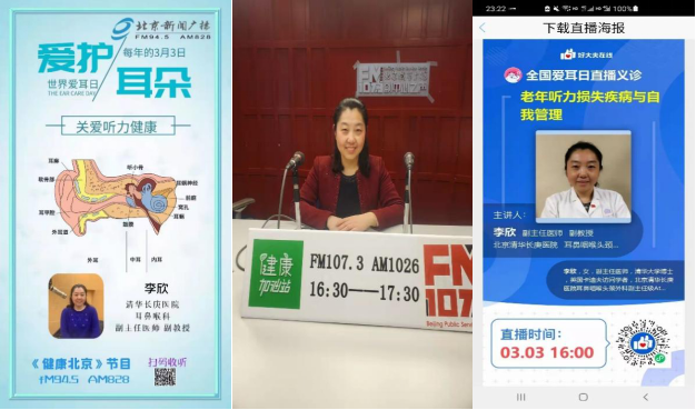爱耳系列活动中,李欣副教授还在北京新闻广播《健康北京》、北京城市广播电台《健康加油站》及好大夫在线科普关于老年性耳聋、梅尼埃病及《爱耳助运动》等相关话题并进行线上健康咨询。
