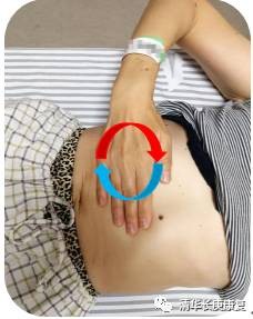 要点:按图示方向顺时针绕着肚脐做静止圆,红色箭头为施压及方向,蓝色箭头为不施压,压力大小以皮肤不发红为标准,手指与接触部位皮肤无相对滑动。