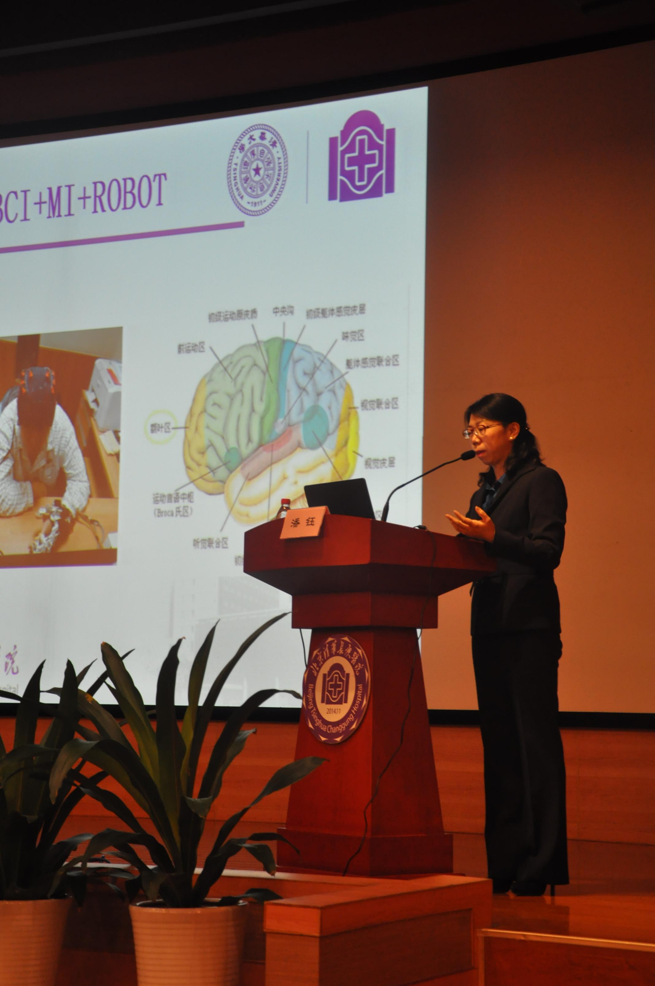 清华大学附属北京清华长庚医院潘钰主任做“脑机接口手外骨骼机器人在手功能康复中应用”主题演讲