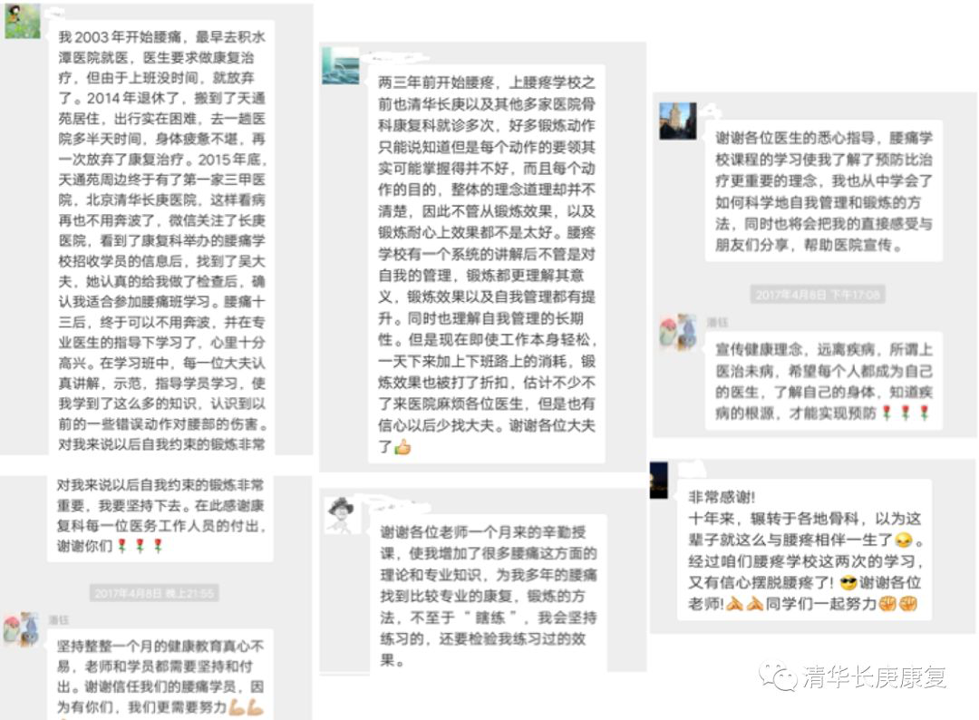 腰痛学校是北京清华长庚医院康复医学科打造的慢病管理的品牌活动,迄今已举办两届。通过以前学员的反馈,参与腰痛学校可提高学员对腰痛的解剖及发病机制的了解,在日常生活中形成良好生活习惯来预防腰痛,以及能有效进行腰痛的自我锻炼和自我管理。相比于其他治疗方法,腰痛的复发率显著降低,患者的生活质量明显提升。以下是部分学员的留言。