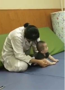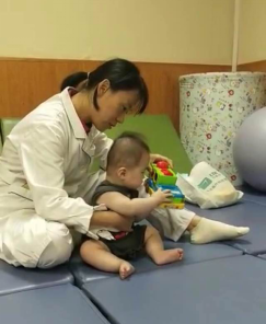 6个月大的小十,因头控欠佳由父母带来清华大学附属北京清华长庚医院康复医学科门诊,经康复医师和治疗师的综合评估,发现小十的粗大运动、精细运动和适应性均落后于正常水平,如双手不能伸向物体、眼睛虽能随移动目标转动但不能达到180度、俯卧位手臂支撑不能将胸腹抬起、俯卧位不能翻身至仰卧位、仰卧位不能抬头等…康复医师和治疗师根据评估结果为小十制定了个性化康复方案,对其进行姿势控制、移动能力、精细运动、视动统合能力等训练,并指导其家长(主要照顾者)为小十进行24小时管理的家庭康复训练,包括日常的抱姿、喂养的姿势及家庭训练计划等。经过一段时间的训练目前小十的运动模式较前改善,在各种体位下头的控制及坐位保持较前均有明显提高,并在引导下可完成翻身运动。