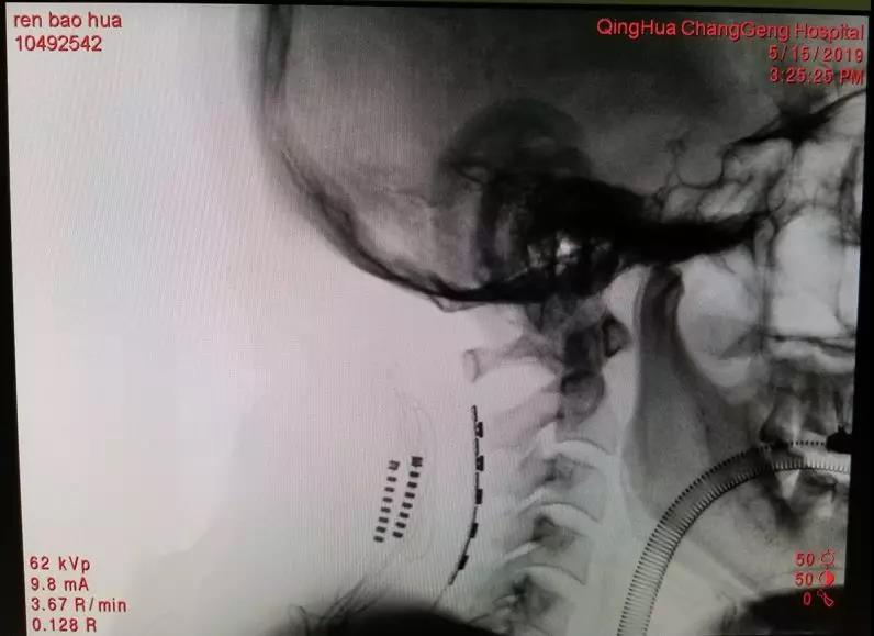 On May 15, 2019, Dr. Jin Wang performed the surgery that implant an electrode sheet in the epidural of the cervical spine, using electrical stimulation to block the conduction of pain signals. There are 16 contacts in 3 rows on the tiny electrode sheet, so that electrical stimulation can be controlled precisely after the surgery. During the surgery, they used intraoperative stimulation combined with neurophysiological monitoring to objectively determine the area of pain that can be covered by electrical stimulation. In the end, they used the O-arm to confirm the precise implantation of the electrode in the cervical epidural space. After stimulation testing for nearly a week after surgery, the patient's left upper limb pain relieved by more than 60%. It was difficult for him to sleep before the surgery because of the pain. But after the surgery, he could sleep for 6 hours per night without medication. In accordance with the clinical trial protocol, Mr. Ren went on to receive implantation of a subcutaneous electrical pulse emitter.