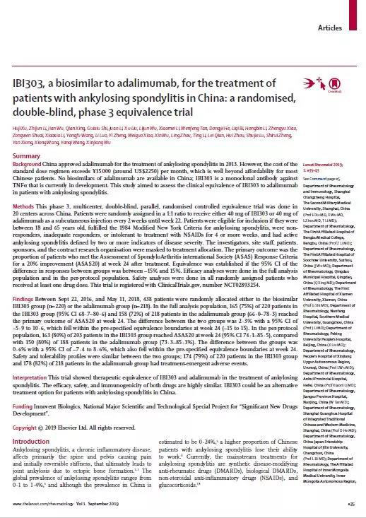 In a paper published in the August 28, 2019 inaugural issue of The Lancet Rheumatology, Professor Huji Xu's team from Beijing Tsinghua Changgung Hospital, Tsinghua University, established clinical equivalence of the domestic biosimilar drugs IBI303 to the control drug adalimumab. This biosimilar drug is expected to benefit patients with ankylosing spondylitis (AS) by lowering the cost of treatment.