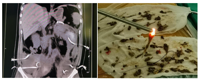 (Left) Wide ranging retroperitoneal necrosis and infection (Right) Necrotic tissue removed through nephroscopy