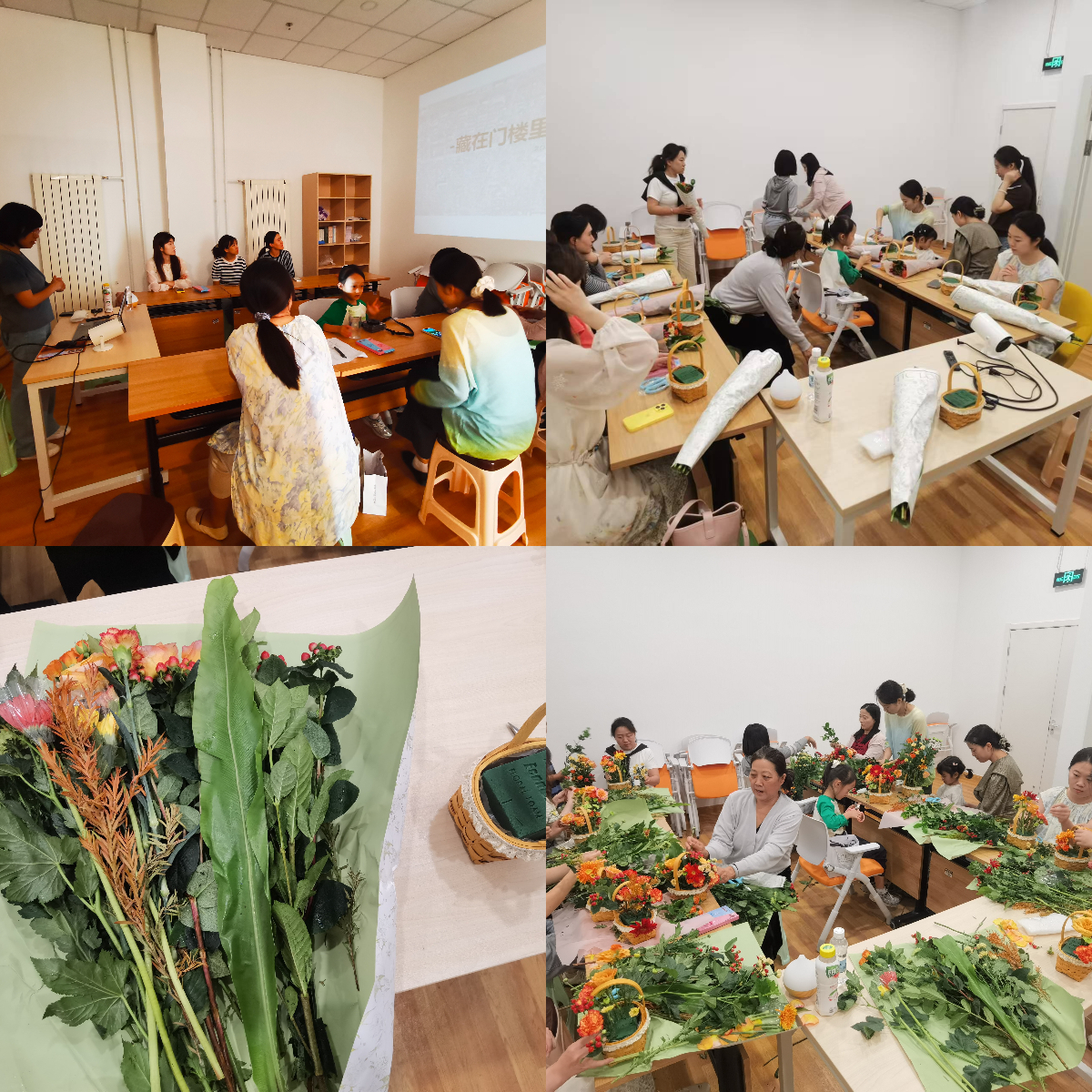 北京慈愿工作站志愿者、北京建筑大学设计研究院园林景观所所长、高级工程师张晓磊老师首先为大家讲解了插花艺术的基本常识,包括花材选择、色彩搭配、构图技巧及修剪养护等知识。老师结合实例演示了插花的基本步骤,从花材的修剪塑形到主次花的搭配摆放,再到点缀花材的巧妙运用,每一个细节都讲解得细致入微,让在场的职工与孩子们快速掌握了插花的核心技巧,享受着亲子合作的乐趣与花艺创作的宁静。现场氛围轻松愉悦,花香与欢声笑语交织,成为 “清心小筑” 内最动人的画面。