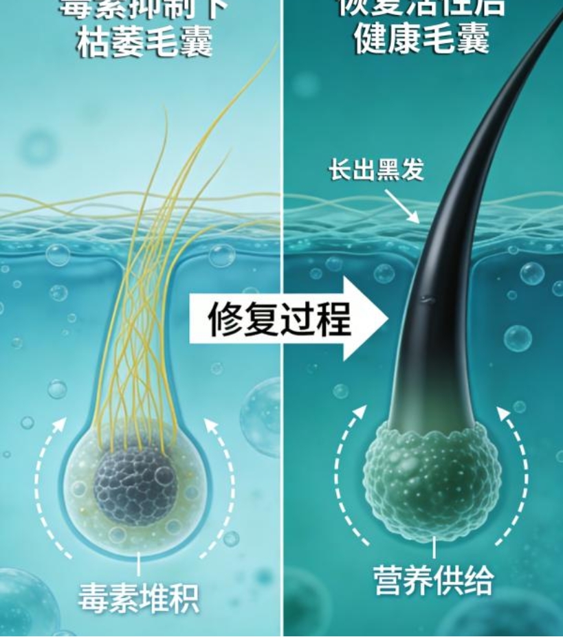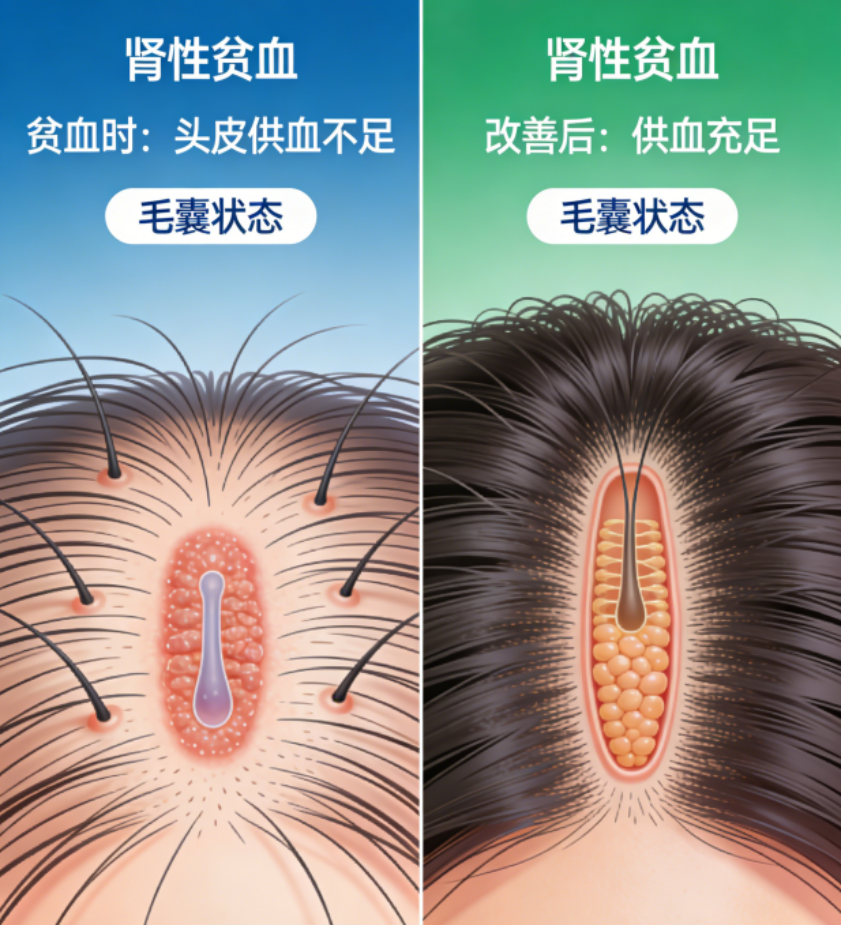 在尿毒症阶段,肾脏失去滤毒、内分泌、造血调控等核心功能,身体长期处于“中毒+缺血+缺营养”的病态中。毛囊作为人体最敏感的末梢器官之一,长期遭受多重损伤:尿毒症毒素持续蓄积,直接抑制毛囊活性,导致毛囊早衰、休眠,黑色素细胞功能下降,头发提前变白、干枯脱落;肾脏无法正常合成促红细胞生成素(EPO),引发顽固性肾性贫血,头皮供血供氧严重不足,毛囊失去生长基础;同时食欲差、蛋白吸收障碍,毛囊长期“营养不良”,毛发状态持续恶化。