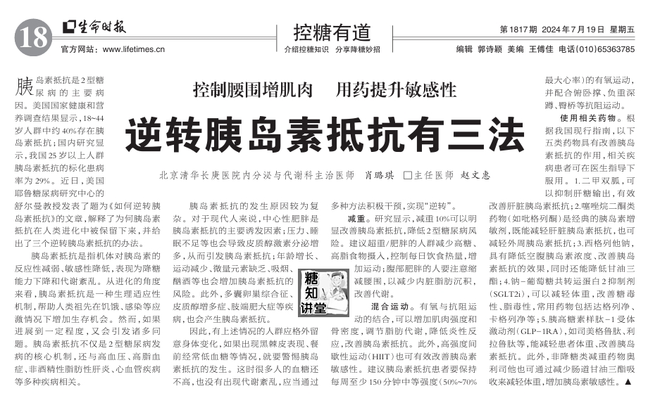 胰岛素抵抗是2型糖尿病的主要病因。美国国家健康和营养调查结果显示,18~44岁人群中约40%存在胰岛素抵抗;国内研究显示,我国25岁以上人群胰岛素抵抗的标化患病率为29%。近日,美国耶鲁糖尿病研究中心的舒尔曼教授发表了题为《如何逆转胰岛素抵抗》的文章,解释了为何胰岛素抵抗在人类进化中被保留下来,并给出了三个逆转胰岛素抵抗的办法。