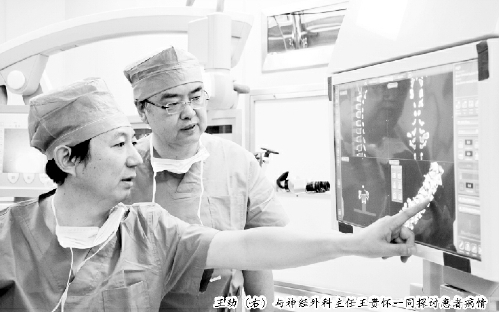 王劲(右)与神经外科主任王贵怀一同探讨患者病情