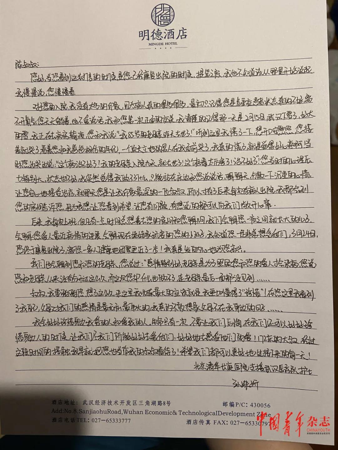 后来,叔叔出院那天,孙姝妍用酒店的信纸写了一封信,在信里回忆起当时的感受。