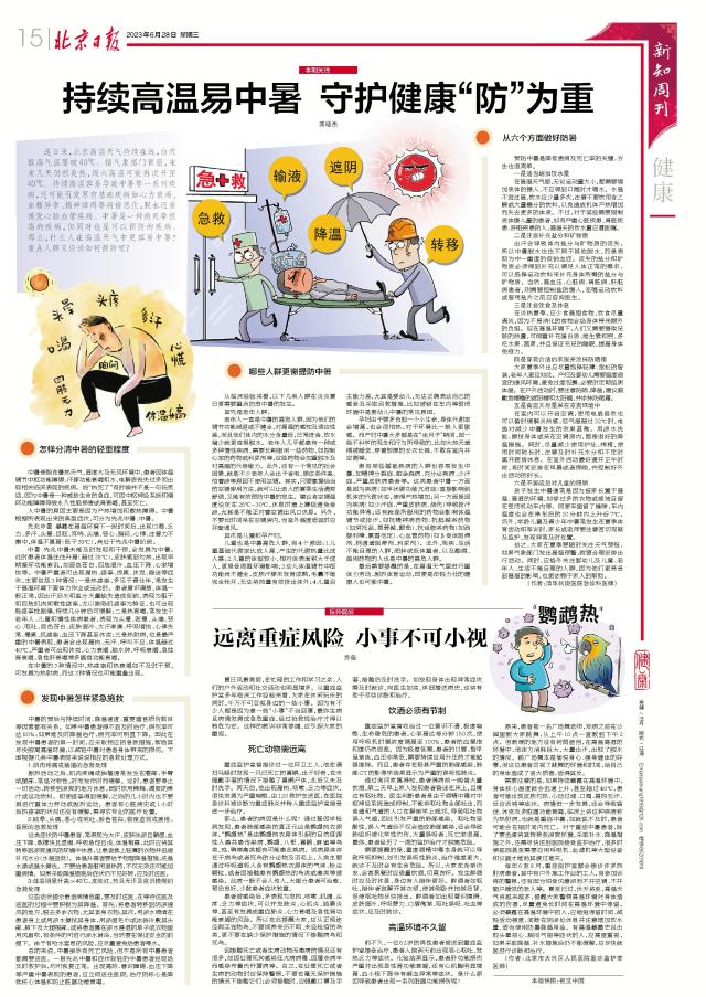 连日来,北京高温天气持续在线,白天最高气温屡破40℃。据气象部门预报,未来几天仍然炎热,周六高温可能再次升至40℃。持续高温容易导致中暑等一系列疾病,还可能引发原有基础疾病如心力衰竭、血糖异常、精神障碍等病情恶化,脱水还易诱发心脑血管疾病。中暑是一种病死率很高的疾病,但同时也是可以预防的疾病。那么,什么人在高温天气中更容易中暑?重点人群又应该如何预防呢?
