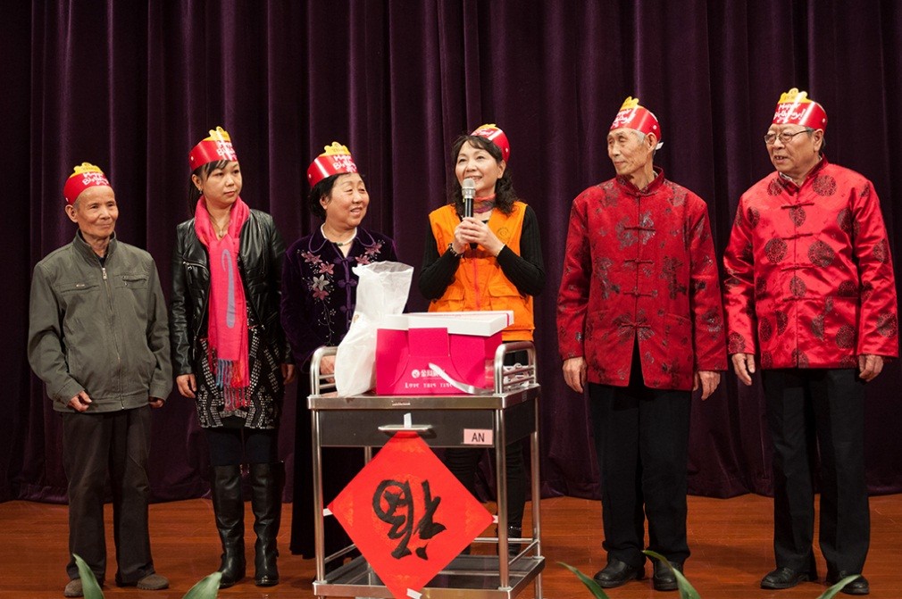 北京清华长庚医院为志愿者寿星庆生,寿星代表上台致谢(袁晋程 摄)