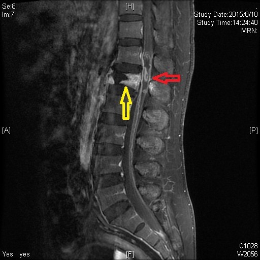 术前MRI:腰1椎体爆裂骨折(黄色箭头),脊髓内出血(红色箭头)。