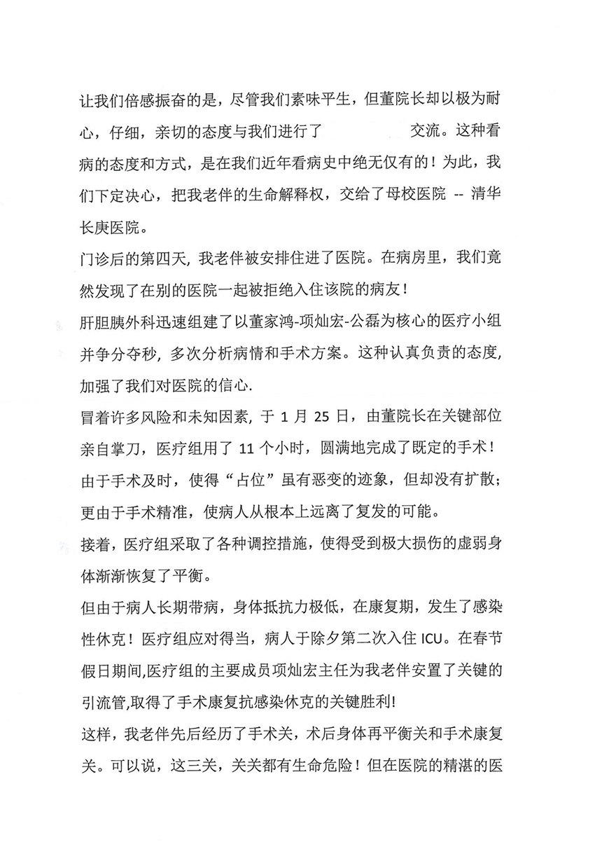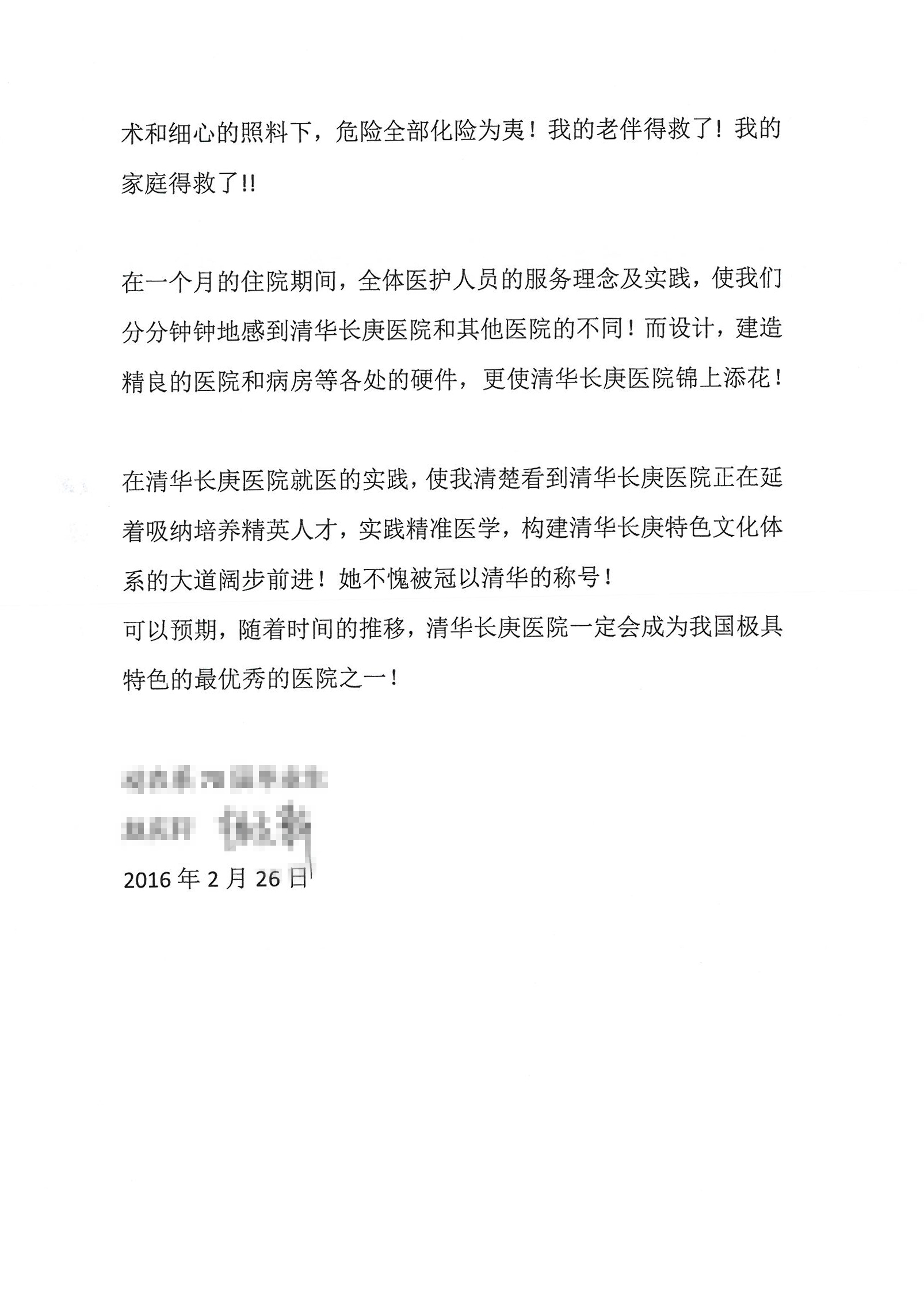 编者按:3月24日,北京清华长庚医院收到了一封由清华大学姜胜耀副校长转寄的感谢信。一位清华校友为给老伴治疗重病,辗转多处,危及生命,最终在北京清华长庚医院肝胆胰中心得到了救治。为表感激,老人家写了一封信,致清华大学校领导,感谢医师救命,感谢母校办医,信中的感激之情乃至一份以母校为傲的情怀,让人温暖。作为清华大学的附属医院,从十年磨一剑的艰苦筹备,到开业运营的稳定发展,到医管局评核出一份患者满意的成绩单,到一封清华校友的感谢信,还有那些未曾计数的一面面锦旗、牌匾、信函,虽然,前路尚远,亦有曲折,但北京清华长庚医院每天都在成长!