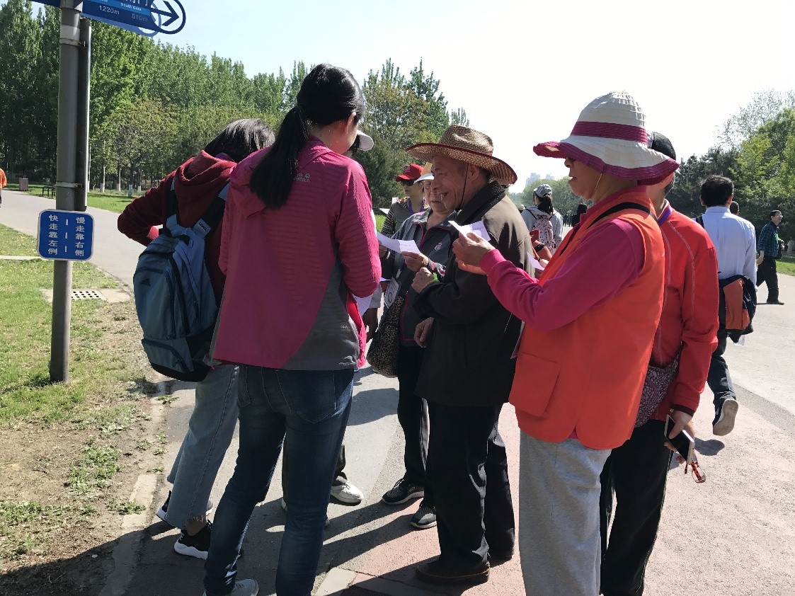早上08:00,糖友们准时到达奥林匹克森林公园北园东门集合,清华长庚医护人员为糖友们监测运动前血糖,8:20糖尿病个案管理师李彩宏带领糖友们做十分钟热身操,该热身操是专为糖尿病患者设计,活动全身关节,强度适中。8:30根据大家的身体素质分为快、中、慢三个分队,在领队的带领下,兵分三队开始5公里健步走。为了增加运动的趣味性,同时让糖友们在游戏中加深对糖尿病的认识,设置了三个关卡。