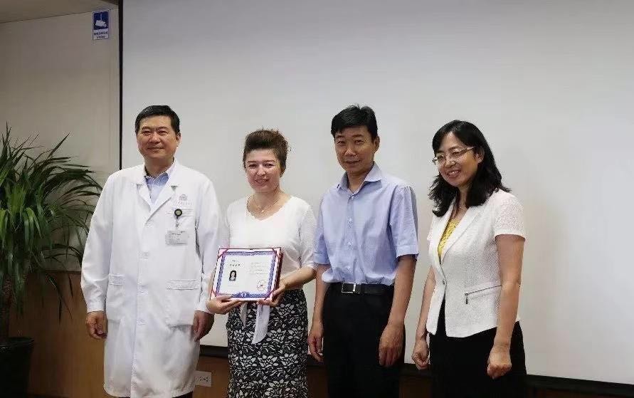 党委书记周月红(右一)、执行院长董家鸿(左一)、清华同方党委书记周立业(右二)一同为新疆进修医师颁发进修结业证书