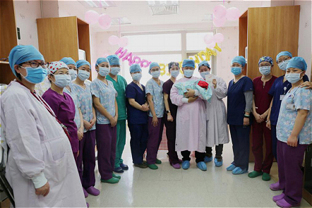 图为“小苹果”出院前在爸爸的怀里和医务人员们合影