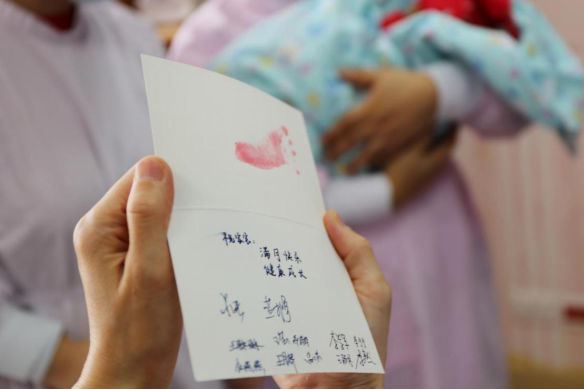 经过听力筛查、头颅超声等检查,小苹果均达标,“接下来还需要再完善眼底检查,并在新生儿专业门诊,新生儿神经发育门诊随诊,定期为早产儿进行神经行为及生长发育评估。”晁爽说。24日,是“小苹果”满月的日子,她也可以在这一天出院回家了,守护她一路走来的医护人员们既开心又有不舍,他们利用中午午休的时间,为“小苹果”办了一个简单的“满月庆”,唱着“亲亲我的宝贝”,医务工作者和“小苹果”的父母都落泪了。接生的医师、儿科所有的医护人员联合签名了祝福贺卡——“满月快乐,健康长大”。(编辑 韩冬野,图/杨欣)