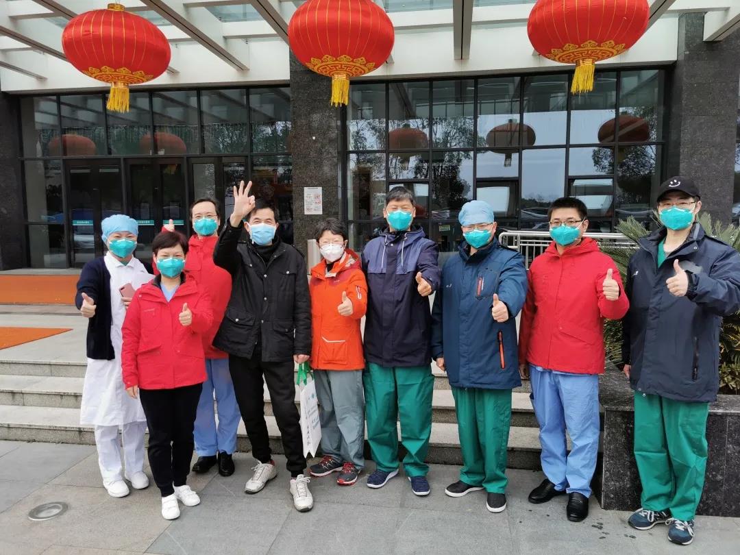 图为北京清华长庚医院援鄂医疗队等为康复患者出院送行