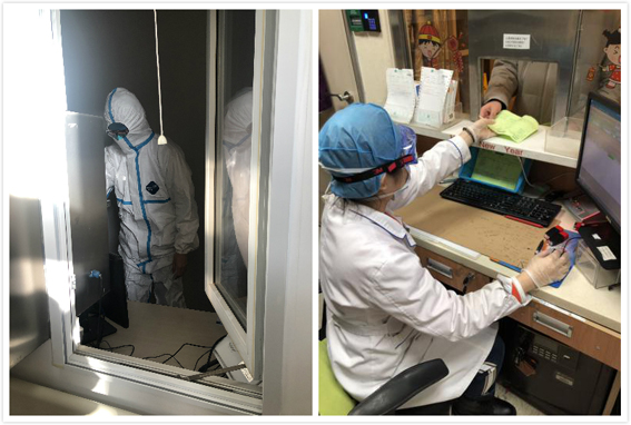 图为发热门诊医事服务人员与急诊科药房人员工作场景