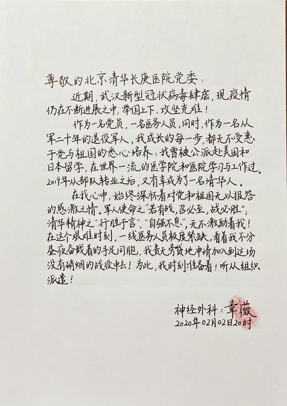 此分队中,有多位军人出身的队员,来自神经外科的章薇医师,在2月1日向院里提交的请战书中写到:“作为一名党员,一名医务人员,同时,作为一名从军二十年的退役军人,我成长的每一步,都无不受惠于党与祖国的悉心培养……在这个艰难时刻,医务人员紧缺,若组织需要,我真切期望,能尽自己的绵薄之力,参与到抗击疫情的战役中去!”来自神经内科的张小峰医师,也曾在部队服役19年,他同样说道:“作为一名医师,一名曾经的军人,这是我们的责任也是我们的使命。”