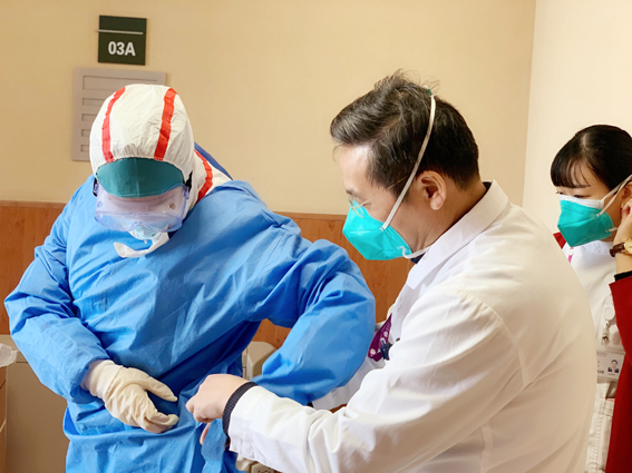 图为感染性疾病科执行主任林明贵在穿脱防护服考核培训中指导储备支援队员