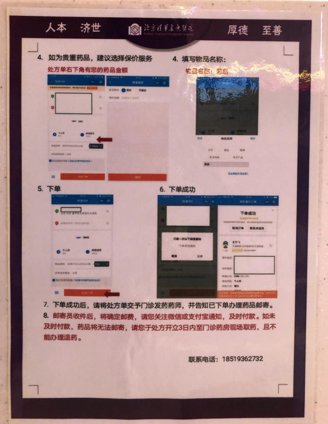 该项服务旨在减少患者排队取药的时间,满足患者的多样化需求,保障疫情期间患者的健康安全。患者看诊缴费后,可在门诊药房前扫描二维码实名在线下单办理药品邮寄,下单成功后将处方单交予门诊药房并告知药师即可,不用在药房前排队取药,可直接回家。药品将通过北京邮政等快递方式,直接从医院药房寄送到患者家中。