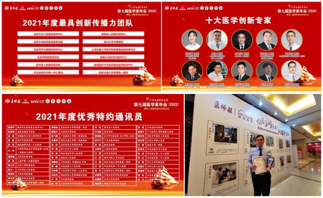 北京清华长庚医院3月21日电(通讯员 于悦超)3月18日,由《医师报》社等主办的“第七届医学家年会(2022)暨第二届医师职业发展论坛”会议在北京召开,我院在本届会议上获得4项荣誉。其中,我院宣传中心获“2021年度最具创新传播力团队”称号,神经外科主任杨学军获“2022第七届医学家年会十大医学创新专家”称号,宣传中心韩冬野获“2021年度优秀特约通讯员”称号。此外,我院心脏内科副主任医师薛亚军的摄影作品《大拇指行动》获“让时间停止 把生命留住——重症的100个瞬间图文故事征集活动全国十佳作品”称号。
