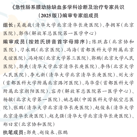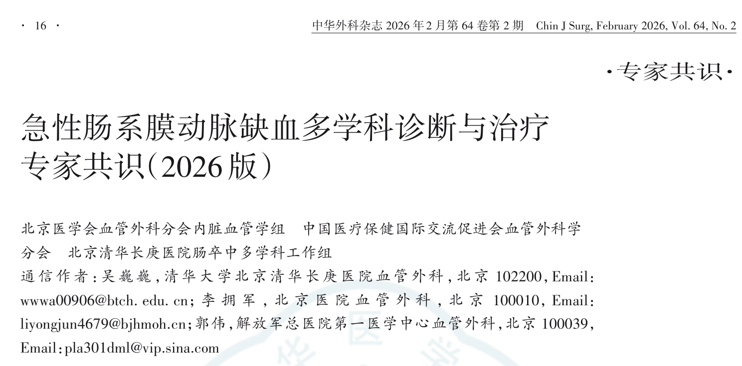 在临床研究基础上,北京清华长庚医院持续深耕,由血管外科及胃肠外科牵头,联合北京医学会血管外科分会内脏血管学组、中国医疗保健国际交流促进会血管外科学分会的多学科专家,共同撰写并发布了《急性肠系膜动脉缺血多学科诊断与治疗专家共识(2026版)》。该共识聚焦急性肠系膜动脉缺血(除外肠系膜动脉夹层),全面整合欧洲血管外科协会(ESVS)、世界急诊外科协会(WSES)及中国医师协会急诊医师分会等国内外最新指南与循证证据,重点突出微创外科技术在此类疾病中的应用进展。