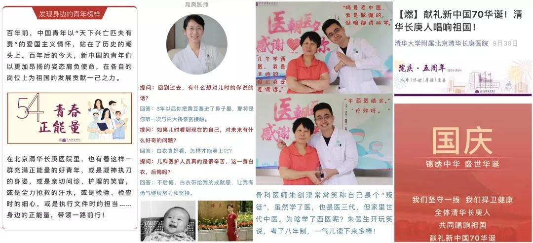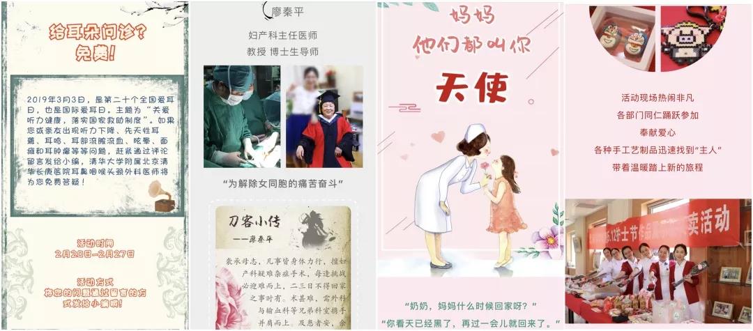 新媒体内容创作上有别于传统媒体,除了新闻类推送,几乎所有内容都需要“接地气儿”加“有个性”,保证时效性的同时还得有温度,所以从前期的策划、构思、拍摄、采访到后期的编辑、制图、排版可以说均为私人定制。看,2019年的妇女节英姿飒爽、爱耳日惠民答疑、青年节阳光向上、护士节漂亮温馨、儿童节的医者童趣、医师节传承奉献、国庆节骄傲自豪、院庆月热烈喜悦……特别希望能够在信息爆炸、万物加速的当下,花功夫用心思做一些留有印记的温暖作品,代表新媒体先给清小庚。