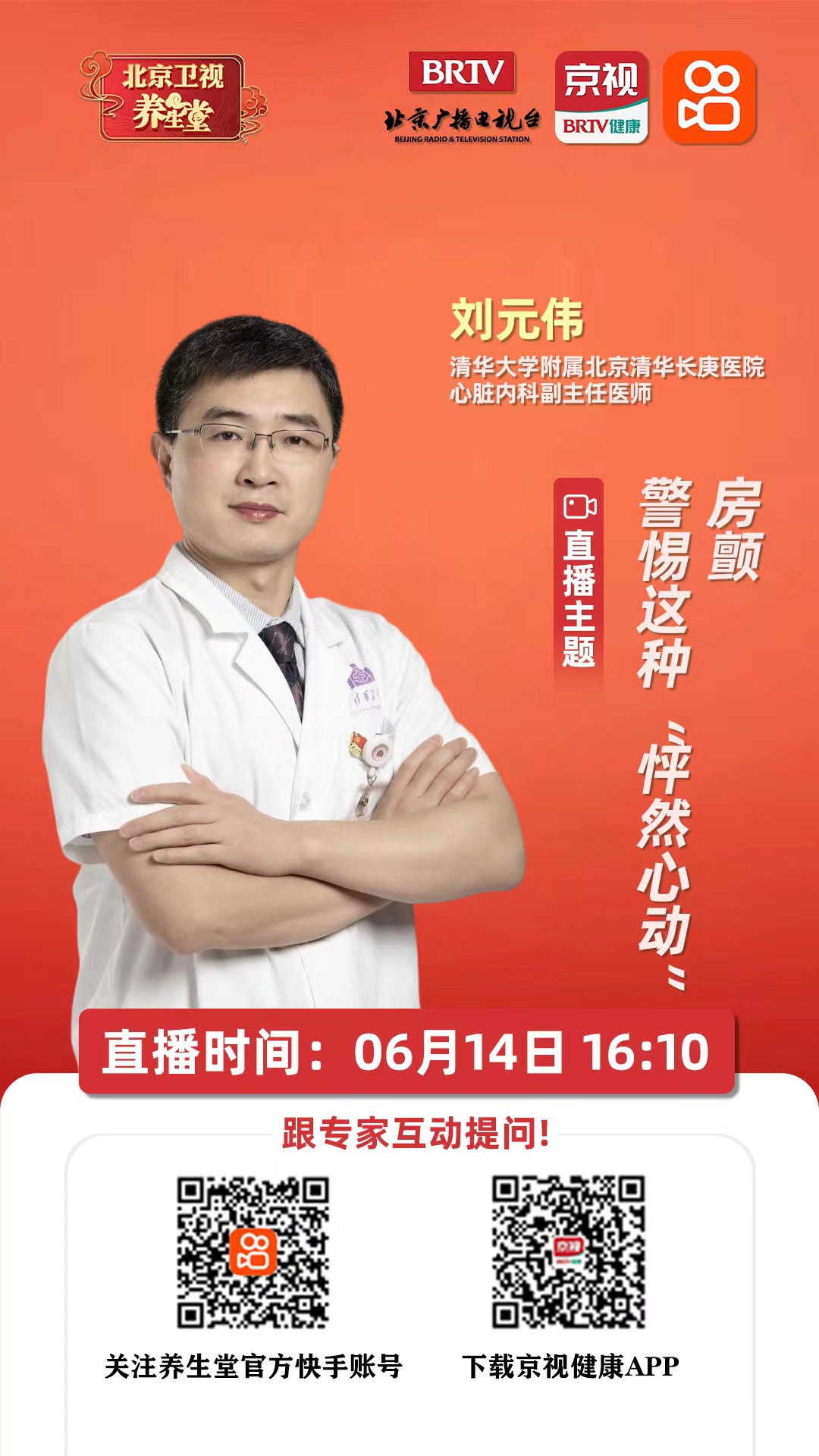房颤是怎么回事?如何察觉自己是否患上房颤?6月14日16:10,我院心血管内科副主任医师刘元伟做客北京卫视《养生堂》直播间,为您解读“房颤 警惕这种‘怦然心动’”。欢迎扫码收看!