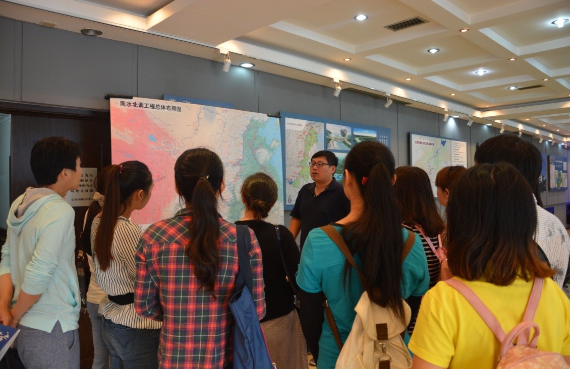 在展室,北京市南水北调办公室的侯主任向我们全面介绍了南水北调工程的历史沿革,并重点讲解了南水北调中线工程特别是北京段的建设情况,使我们更加深入的了解了南水北调工程的进展以及南水北调工程给我们生活带来的巨大益处。同时,侯主任还模拟展示了南水北调工程的实施过程,在施工过程中,为保证北京市居民正常生活、保证地上交通不停运、南水北调人发挥智慧才能,创造性的研发出运输巨型PCCP管(直径为4米的输水管)运输车,攻坚克难,解决北京市缺水问题。听着解说,看着实景,我们更感受到南水北调这一伟大壮举的来之不易。团城湖作为南水北调中线工程的终点,这个目前已建成水面面积33公顷、调蓄量127万立方米的“大水缸”,承担着容纳南水北调来水、满足首都自来水厂供水变化、水源应急切换要求和分配水量、回补北京密云水库等多项重任。当需要紧急切换水源时,调节池还将承担临时供水的任务,预计可紧急供应北京市民用水12小时。