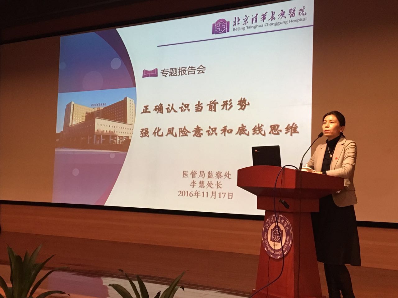 北京清华长庚医院(通讯员 巩昕宜 )11月17日下午,北京市医院管理局监察处处长李慧为我院作了“正确认识当前形势,强化风险意识和底线思维”专题报告,北京清华长庚医院院级主管、临床各部长、科主任、医技、管理部门二级及以上主管、护理部护理长、工会主席、各党支部书记、组织委员(兼纪检委员),团委书记等百余人参加了报告会,主管纪检工作的陈旭岩副书记主持报告会。