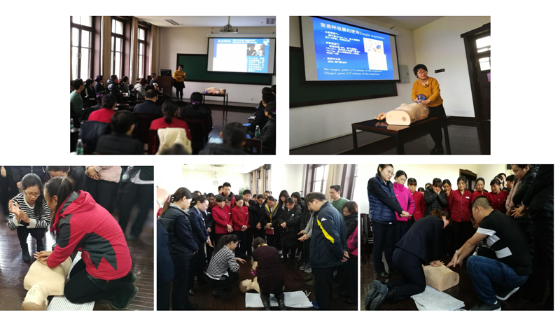 首先组织委员宋琳琳医生从身边的案例出发强调心肺复苏的重要性,强调实施抢救的黄金时段,说明急救事件可能就会发生在身边,迅速引起大家的关注。在介绍了心肺复苏的发展历史,详细讲解了心肺复苏的操作方法,胸外按压,简易辅助呼吸,整个会场座无虚席。参与培训的人员也都全神贯注,为了留学生更好的理解,宋琳琳医生还为国际友人现场翻译,和大家分享更多的急救知识。随后徐甜甜护士和大家分享海姆立希急救法,教大家在成人、婴幼儿发生异物堵塞气道时如何采取紧急措施,自救或者救人,通过现场示范帮助大家快速理解,清楚明白。