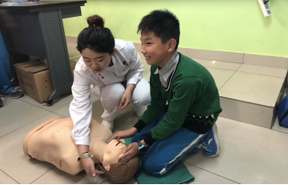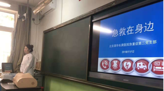 首先,急重症第二党支部的党员、重症医学科护理人员宿文琪为大家进行心肺复苏术培训。心肺复苏术运用于抢救心脏骤停离的状况,心脏骤停离我们其实并不遥远,日常溺水、触电、外伤、异物吸入、疾病发作、煤气中毒、过敏等意外均可导致心脏骤停或窒息,并发生猝死。培训开始我们播放了一段急救视频,迅速吸引了同学们的注意,并激发了同学们的好奇心。授课过程中,与同学互动良好。理论授课后,急重症第二党支部的党员、重症医学科护理人员周绪涛、苗卉为同学们模拟演示了心肺复苏术的操作流程。最后同学们自由组合成急救团队模拟抢救现场,将这个课堂的氛围推上了高潮。